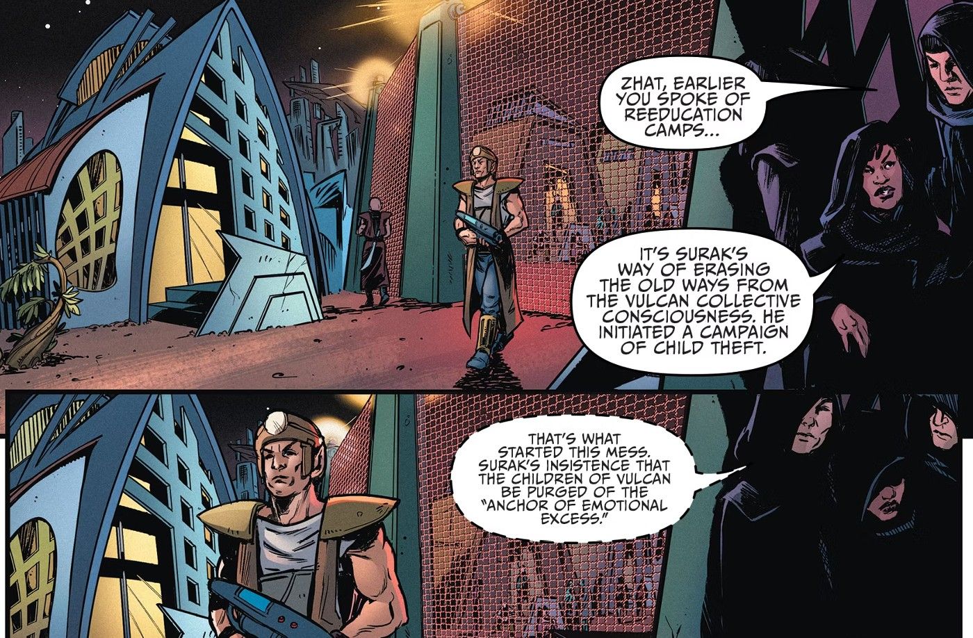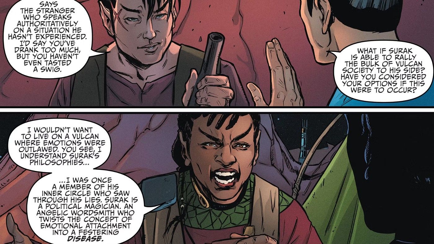 Es decir, hasta este número, que fue escrito por Brandon Easton y dibujado por Silvia Califano. Mister Spock ha sido enviado atrás en el tiempo, a los últimos días de la Guerra Civil Vulcana. Las fuerzas de Surak han logrado enormes avances y pronto controlarán el planeta. Spock se encuentra con los rebeldes que se resisten a Surak, y para Spock, quien ha sido criado para creer que Surak salvó a su especie, es una experiencia discordante. Los rebeldes pintan una imagen terrible de Surak y su filosofía; temen que si el planeta abraza las creencias de Surak, será el fin de la cultura y el arte de Vulcano. Además, le revelan a Spock la existencia de “campos de reeducación”, creado por Surak para adoctrinar a los jóvenes y prisioneros en su filosofía. Star Trek los fanáticos saben cómo se desarrollará el resto de la historia: los rebeldes detonarán un arma nuclear en un intento de matar a Surak, pero fallarán y finalmente convencerán al resto del planeta para que lo siga. Estos rebeldes luego abandonarán Vulcan y fundarán el Imperio Romulano.