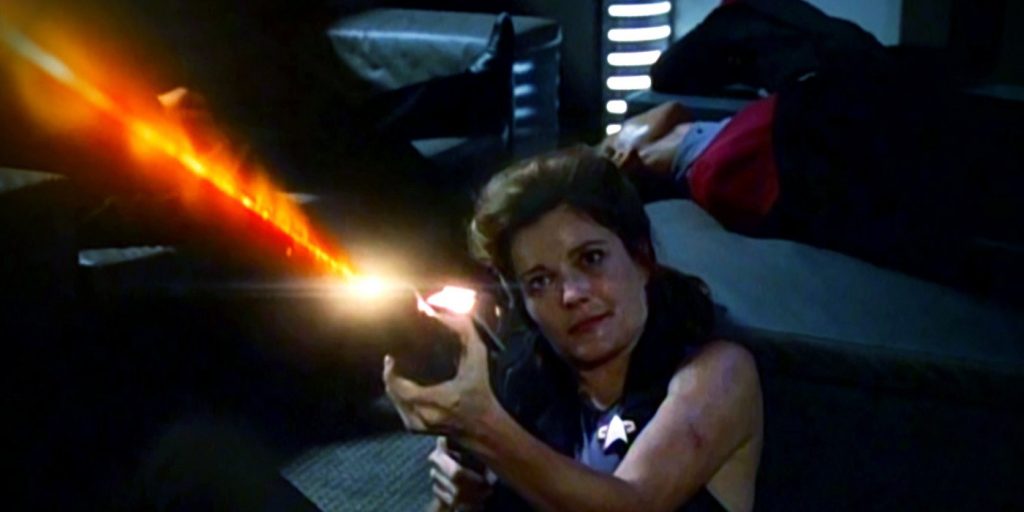 Es tan horrible como suena, y Janeway no pierde la calma por un segundo. Son ella y el Doctor contra una nave llena de virus voladores y rastreros. Incluso deja caer su arma en un punto y saca un cuchillo para ensartar a uno de los alienígenas en el combate cuerpo a cuerpo.