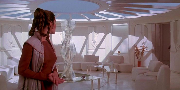 Como líder de la Alianza Rebelde, Mon Mothma es una mujer que debe atraer la atención y el respeto de todos. Cuando se presenta frente a toda la Rebelión, lo hace con un vestido en capas blanco increíblemente regio, que se acentúa aún más con collares y colgantes en capas. Es un atuendo relativamente simple para el Guerra de las Galaxias universo, pero su simplicidad lo hace aún más impresionante.