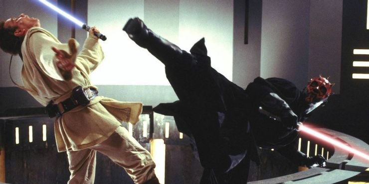 Esta batalla obviamente se extiende a ser una secuencia de escenas en lugar de solo una, pero debe incluirse cuando se habla de la rivalidad de los dos. Maul matando a Qui-Gon fue un momento crucial en la saga Skywalker por muchas razones, y Obi-Wan cortando a Maul por la mitad fue el verdadero comienzo de esta inmensa rivalidad. Pero en realidad, todo el duelo es increíblemente bueno.