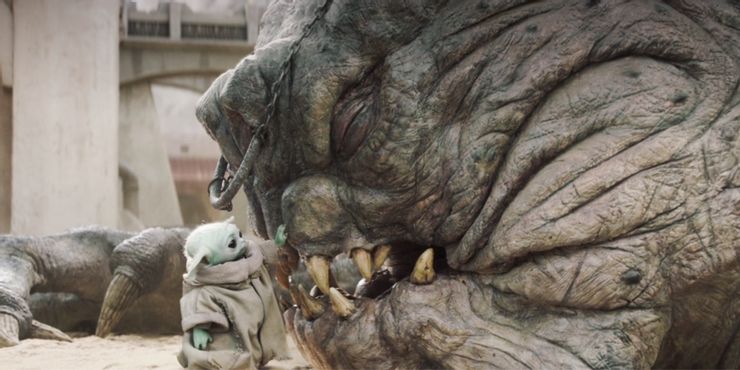 En el medio de El libro de Boba FettEn la secuencia de batalla culminante de Mando, con un rancor suelto y los Pykes disparando desde todas las direcciones, Mando se sorprende al toparse con Grogu, quien voló hasta Tatooine para reunirse con su figura paterna con casco. Grogu salta y le da un fuerte abrazo a Mando.