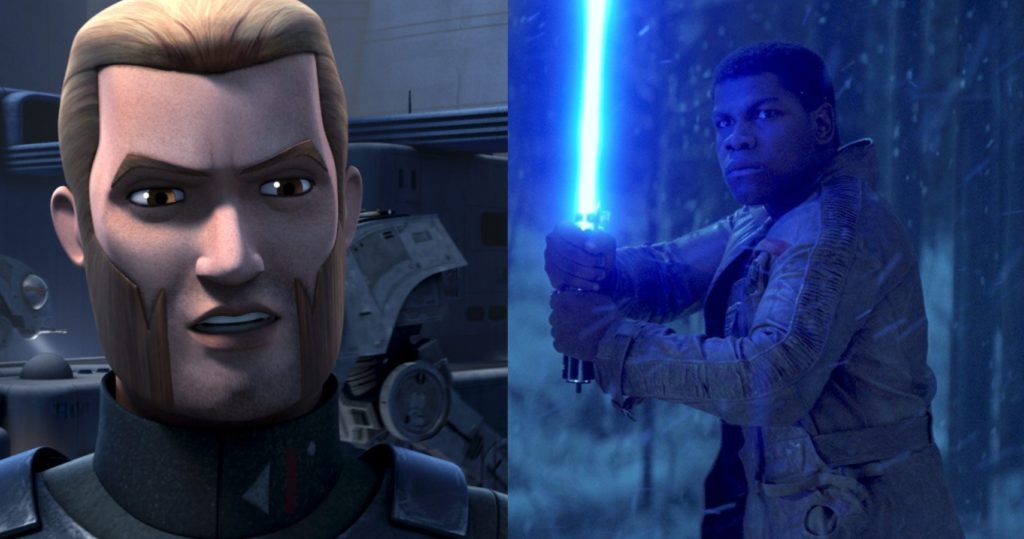 En la secuencia de apertura de la película, nos presentan a Finn como un soldado de asalto que experimenta lo que parece ser un ataque de pánico durante su primera batalla después de que un compañero ha sido asesinado a su lado. Cuando Kylo Ren y el Capitán Phasma ordenan la ejecución de los aldeanos restantes, Finn no puede encontrarlo en él para matar por ellos. Sin embargo, no es hasta The Last Jedi que Finn encuentra sus pies en la Rebelión, orgullosamente consolidándose como rebelde después de derrotar a Phasma.