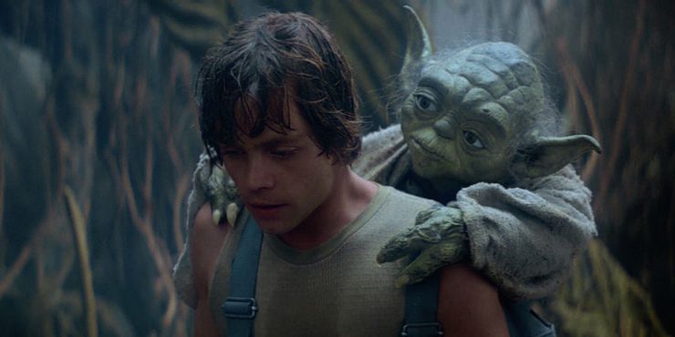 En El imperio Contraataca, Luke viaja a Dagobah para ser entrenado en los caminos de la Fuerza por un legendario maestro Jedi llamado Yoda. Luke pasa el montaje de entrenamiento con Yoda en su espalda, impartiendo sabiduría directamente en su oído.