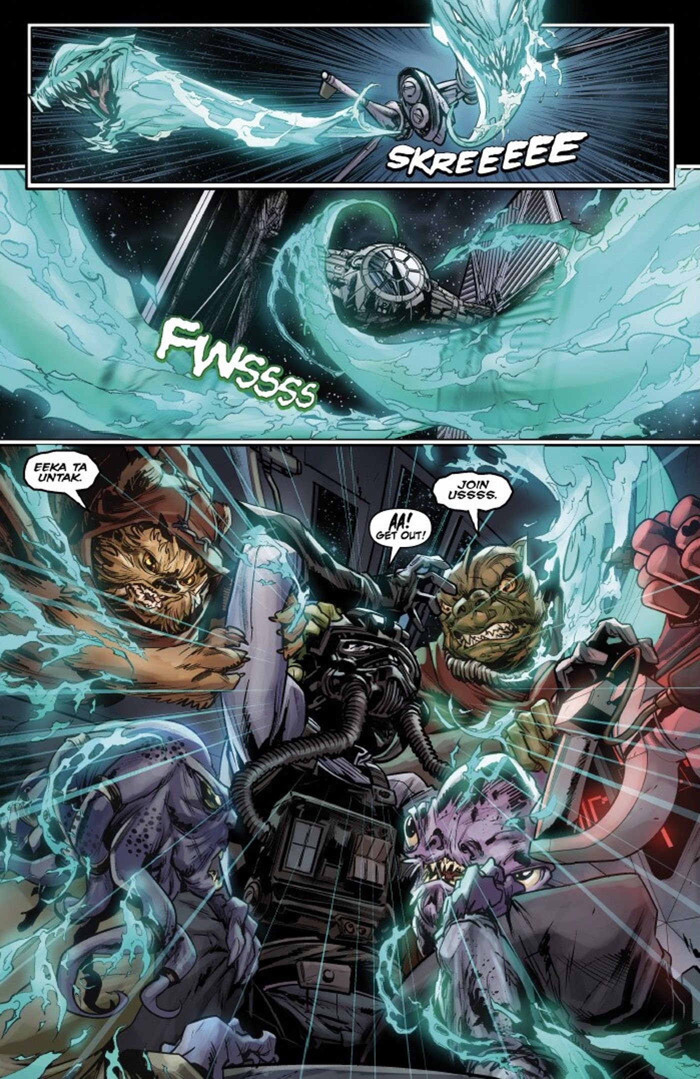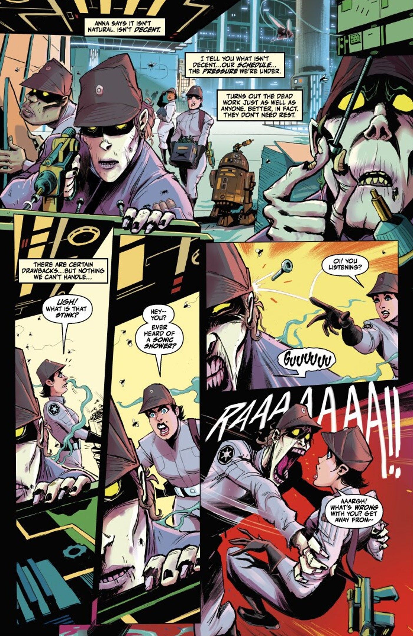 Los ewoks siempre han sido una presencia algo espeluznante en el Guerra de las Galaxias universo. Evidencia de El regreso del Jedi sugirió que los Ewoks comieron humanos capturados, algo que fue confirmado por los materiales de enlace liberados bajo el Leyendas canon. Sin embargo, no hay nada implícito acerca de este Ewok demoníaco, que se dispara por el espacio como un fantasma aterrador, solo para matar a un piloto imperial. Es probable que estos seres sean asesinados por las fuerzas del Imperio, en busca de venganza en una clásica historia de fantasmas. Otras páginas confirman que los trabajadores zombis de la Estrella de la Muerte y el monstruoso ‘gran juego’ estarán entre las amenazas supuestamente no canónicas incluidas en el número.