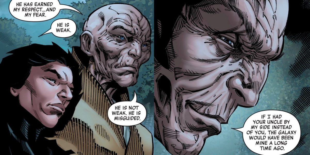Sin embargo, las semillas de la revelación de Palpatine se habían plantado anteriormente en el Guerra de las Galaxias universo, específicamente en el cómic Star Wars: Age of Resistance – Líder Supremo Snoke serie. Confirmado por el escritor de cómics Tom Taylor en Gorjeo, una escena particular en el Era de resistencia La serie no solo tenía como objetivo dar contexto y proporcionar una atmósfera para la situación en cuestión, sino que también presagiaba lo que pronto se revelaría en la pantalla grande. Echa un vistazo a los paneles que Taylor compartió a continuación: