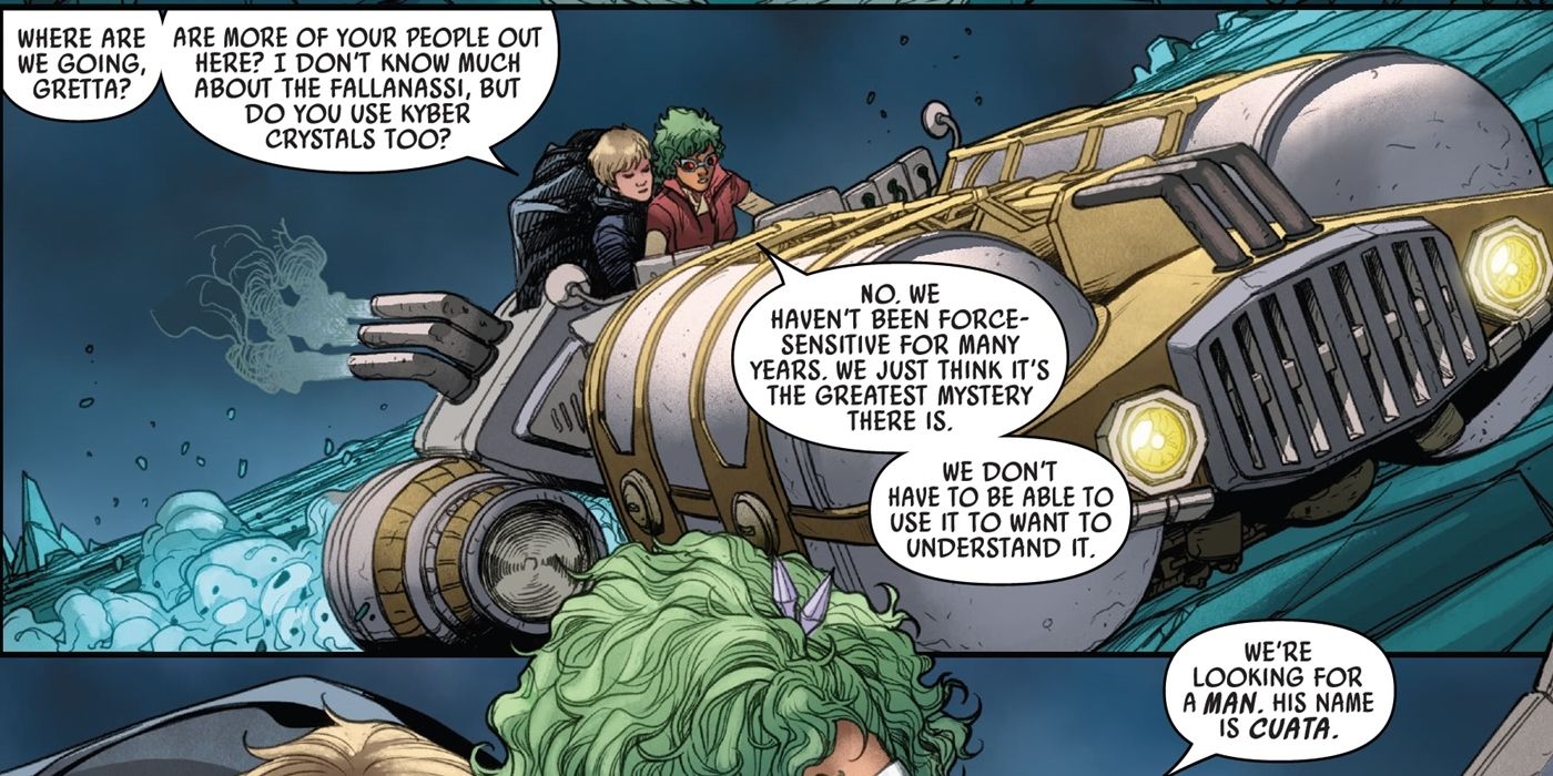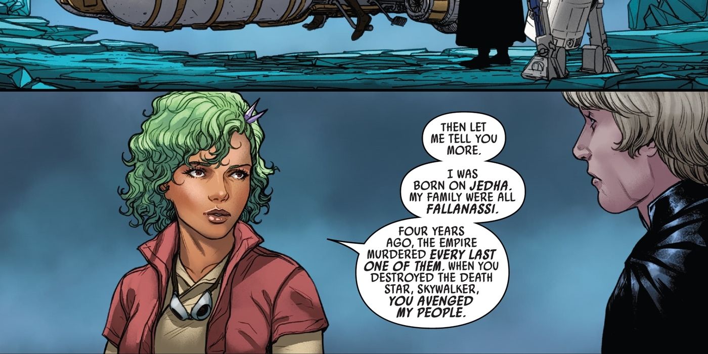 Cuando se le preguntó específicamente por qué lo estaba ayudando, Gretta le dice a Luke que ella y su familia eran Fallanassi, y que cuatro años antes de los eventos de este cómic (que se desarrolla entre Episodio V y Episodio VI), el Imperio eliminó hasta el último miembro de su religión, erradicando efectivamente toda su cultura de la galaxia. Entonces, cuando Luke destruyó la primera Estrella de la Muerte, sin darse cuenta vengó a su gente. Esta revelación de que el Imperio fue secretamente responsable del genocidio de toda una religión basada en la Fuerza justo debajo de las narices de todos fue impactante, por decir lo menos, pero otra tragedia golpeó al pueblo Fallanassi antes de que fueran asesinados. Según Gretta, los Fallanassi perdieron su conexión con la Fuerza hace muchos años, y solo continuaron adorando a la Corriente Blanca a través del texto y la creencia en lugar de la práctica real, y usaron los Cristales Kyber para guiar sus ceremonias (así es como Gretta sabía dónde estaba). para encontrarlos).