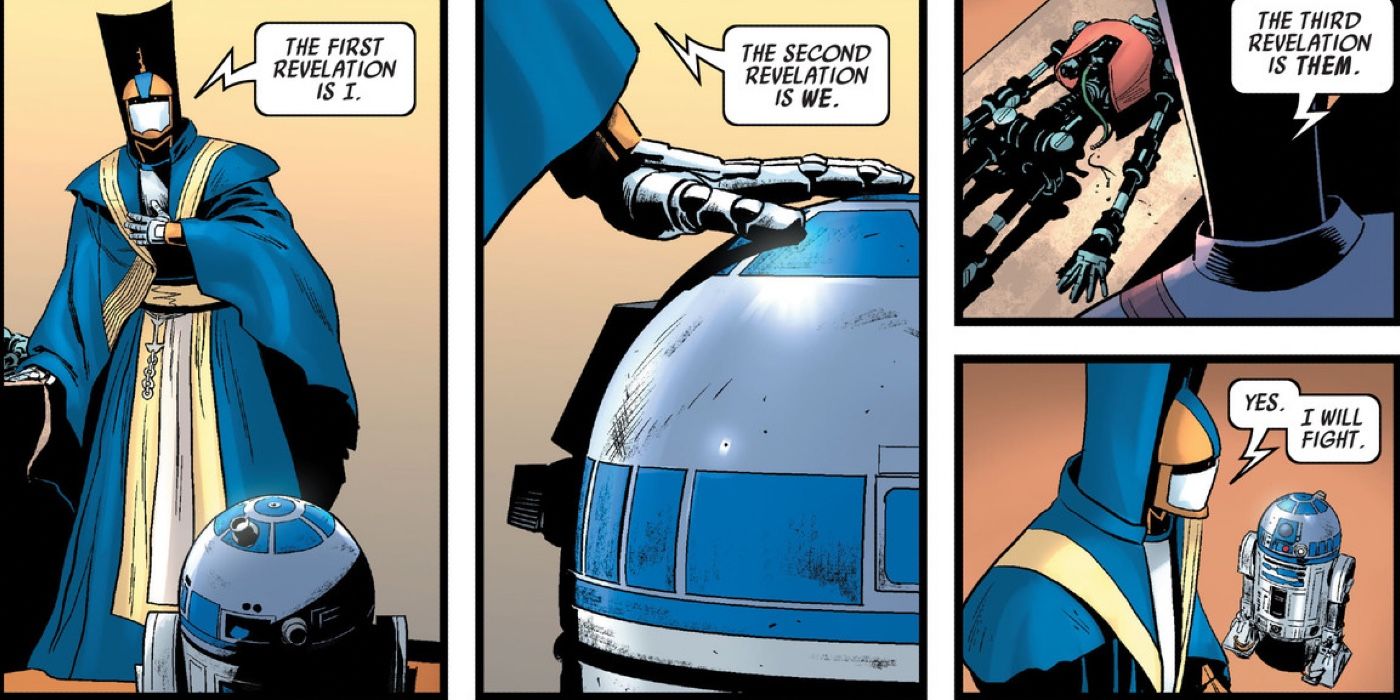 “/> Se especula desde hace décadas que R2 es uno de los pocos completamente droides inteligentes en la galaxia, lo que significa que puede pensar y actuar como un individuo separado de cualquier función o sistema preprogramado: esta teoría de los fanáticos ha demostrado ser correcta en Star Wars: Droides Oscuros #4, de Charles Soule y Luke Ross, después de que R2 se encuentra con un droide luchador por la libertad de siglos de antigüedad llamado Ajax Sigma. Esforzándose por dar verdadera conciencia a tantos de su calaña como sea posible, Ajax menciona cómo todos los droides presentes, como R2, el psicótico Triple-Zero y BT-1, los cazarrecompensas 4-LOM e IG-88, e incluso los visualmente distintos. astromecánico QT-KT: “…debe ser visionado” haciendo oficial que R2 es de hecho un verdadero ser sensibley como muchos fanáticos ya han postulado, siempre lo ha sido.