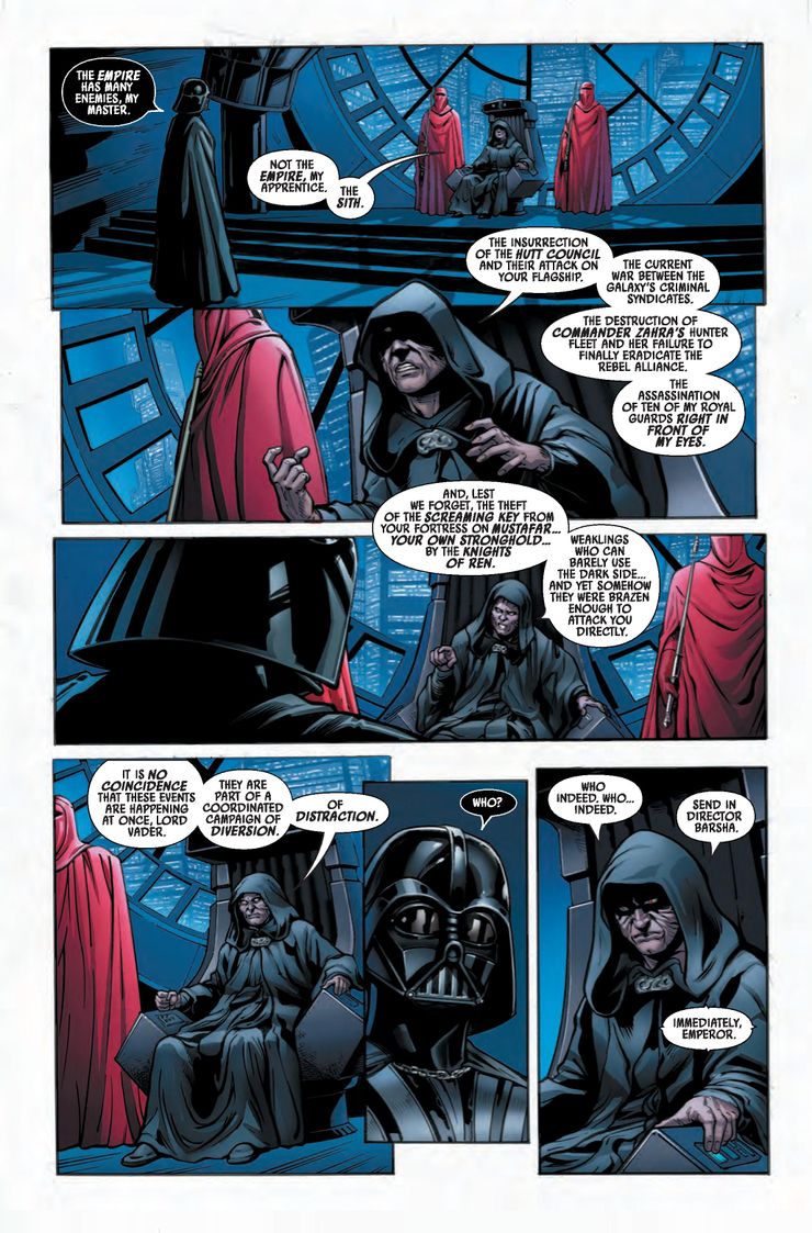 Después de varias ofensivas en las que Crimson Dawn inició una guerra de sindicatos, robó el castillo de Darth Vader y asesinó a los guardias reales del Emperador justo en frente de él, Darth Sidious ya no puede tolerar a Crimson Dawn en la nueva vista previa de Reinado Carmesí #5. Convocando a Darth Vader, que ha estado persiguiendo a Crimson Dawn y sus agentes dentro del propio Imperio, los Sith Lords están listos para contraatacar mientras Lady Qi’ra se prepara para ejecutar la siguiente fase de su plan. Aquí están las páginas de vista previa y la sinopsis del próximo número: