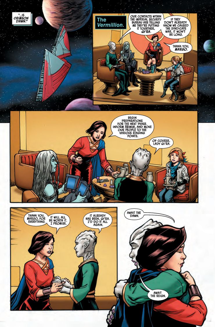 En números anteriores de Reino carmesí de Charles Soule y Steven Cummings, Lady Qi’ra ha estado haciendo grandes movimientos mientras Crimson Dawn busca cambiar el equilibrio de poder en la galaxia. Sabiendo la verdad sobre el liderazgo del Imperio de su difunto mentor y ex Lord Sith Darth Maul Qi’ra se niega a dejar que los Sith gobiernen por más tiempo, reuniendo aliados de ideas afines para su causa, como los Caballeros de Ren. Mientras que el evento cruzado anterior Guerra de los cazarrecompensas vio el regreso de Crimson Dawn a la galaxia como un jugador importante, Reino carmesí ha estado mostrando todos los diversos planes que Qi’ra ha puesto en marcha para mostrarle al Emperador que no es tan intocable como cree.