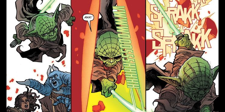Guerra de las Galaxias: Aventuras de la Alta República # 2 del escritor Daniel José Older y el artista Harvey Tolibao ve a los Maestros Jedi Yoda y Buck llegar para ayudar a sus estudiantes a enfrentarse al Nihil. El extremadamente poderoso Yoda no solo lidera la carga contra los malvados merodeadores, sino que también contrarresta varios de sus ataques, en un momento saltando frente a sus Padawans para bloquear una explosión de una poderosa arma de energía Nihil con un golpe de sable de luz cronometrado por expertos. Como era de esperar, los impresionantes actos heroicos de Yoda son notados y reconocidos rápidamente por el líder de Nihil.