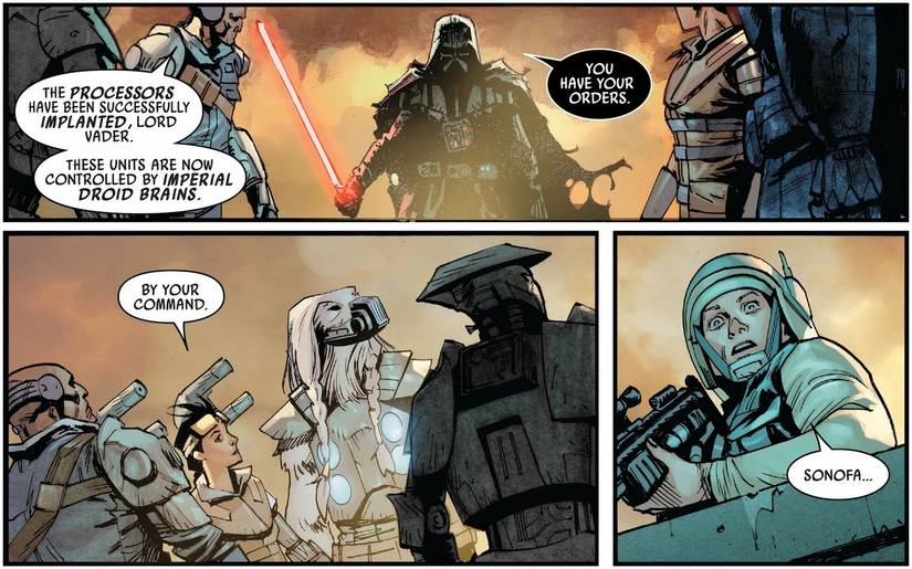Darth Vader exploró todas las vías de poder en su misión de matar al Emperador Palpatine y tomar su lugar como gobernante de la galaxia, incluido algo que inicialmente se presentó como una gran amenaza. durante el Droides oscuros En el arco de la historia, los circuitos de Vader fueron infectados por una mente colmena de IA llamada Scourge, que temporalmente se hizo cargo del traje de Darth Vader y lo agregó a su mente colmena establecida. Sin embargo, en lugar de convertirlo en su esclavo, Scourge le mostró a Darth Vader cómo los androides y cyborgs podían ser controlados remotamente por una inteligencia superior, por lo que Vader decidió hacer lo mismo.
