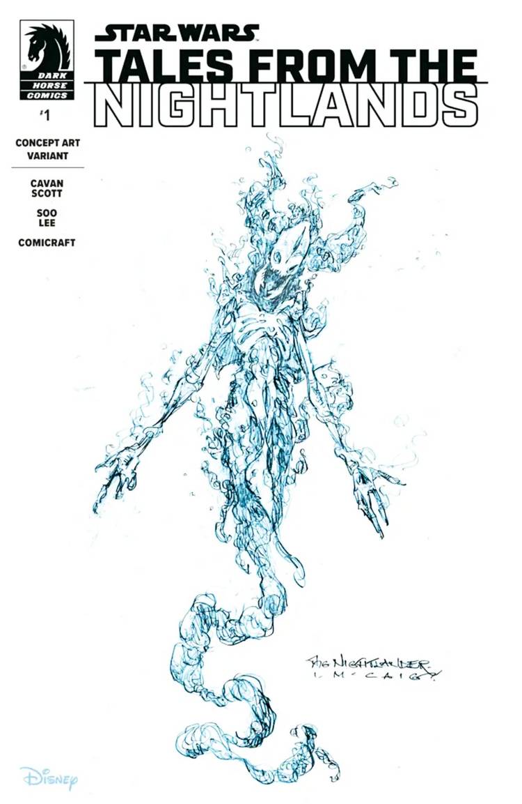 La portada principal para Cuentos de las Nightlands El #1 da una visión de una figura espectral, con tres ojos brillantes, dedos inhumanos afilados y colmillos, que se avecinan sobre la superficie rocosa de un planeta mientras un plan de nave espacial aterriza, y dos figuras, presumiblemente anakin y obi-wan, emergen. Fangoria también reveló una portada de variante de arte conceptual para el tema, lo que brinda a los lectores una sensación aún mejor del ser espectroal y etéreo que será la pieza central de esto. Star Wars incursión en terror.