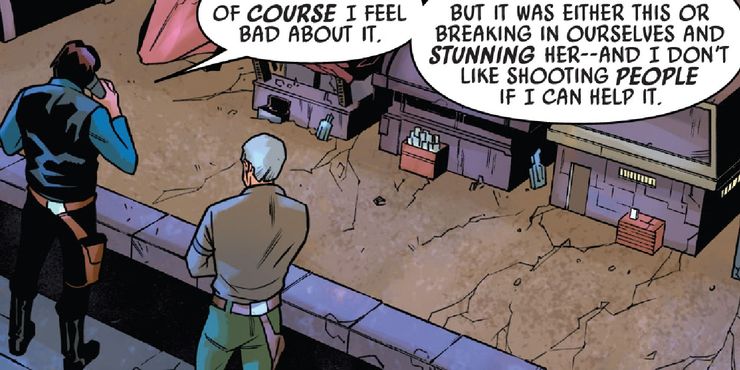 en el comic Han Solo y Chewbacca #3 por Marc Guggenheim y David Messina, Han y Chewie son contratados por Jabba the Hutt para encontrar una urna con las cenizas de su rival muerto. Después de una serie de intentos fallidos, encuentran la urna y debaten cómo robarla. Han inmediatamente descarta irrumpir y aturdir a la mujer propietaria, diciendo: “No me gusta dispararle a la gente si puedo evitarlo”. Esta mentalidad se relaciona directamente con su encuentro posterior con Greedo, ya que Han deja en claro que no le dispararía si la situación aún pudiera resolverse pacíficamente. Aquí, el canon moderno duplica la idea de que incluso antes de conocer a Luke y Leia, Han no era el tipo de persona que mataría si pudiera evitarlo.