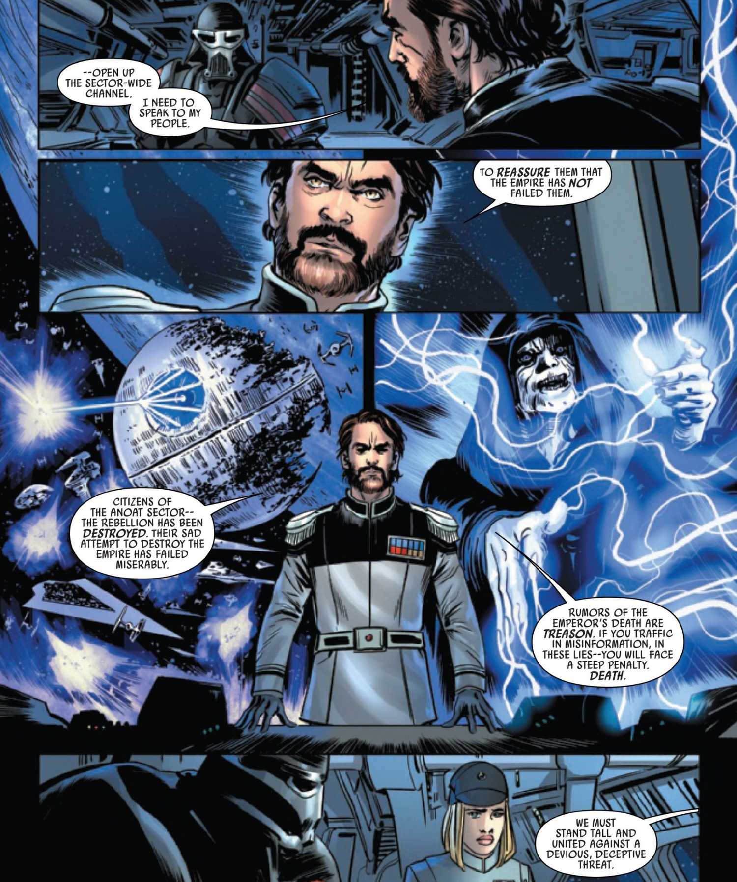 El almirante Sloane expresa su preocupación por el hecho de que el Moff Adelhard se vuelva rebelde, transmita propaganda que afirma que el Imperio sigue siendo tan fuerte como siempre e intente usar el nombre de Palpatine para apuntalar su propia base de poder.