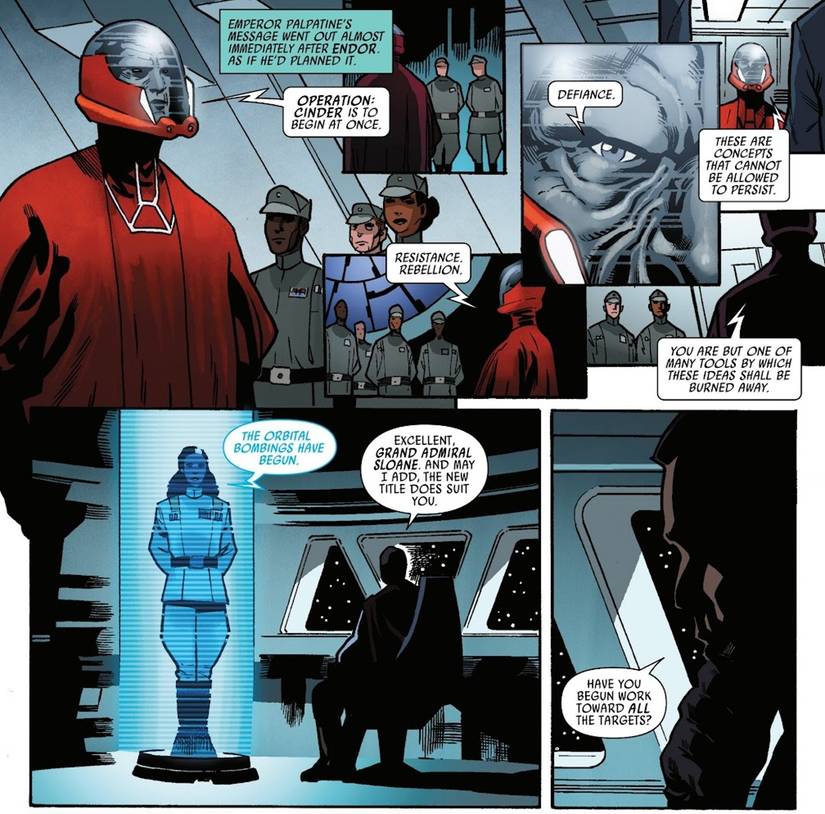 En La batalla de Jakku – Insurgency Rising #2 Por el equipo creativo de Alex Segura, Leonard Kirk, Rachelle Rosenberg y Joe Caramagna, las órdenes del Emperador se entregan al destructor estelar de Gallius Rax, el Estragoy la recientemente ascendida Gran Almirante Rae Sloane informa del éxito de la Operación: Bombardeos de Cinder. Sin embargo, se confirma que hay obstáculos al gran plan de Palpatine.