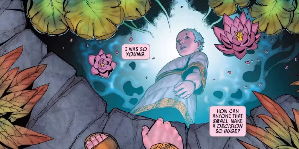 Star Wars: Caballeros Jedi El número 8, de Marc Guggenheim y Madibek Musabekov, comienza con el reclutamiento de un nuevo iniciado Jedi llamado Soona. Su potencial de Fuerza es descubierto por buscadores Jedi llamados Seera Longa y Berem Khana, y la conversación toma un giro triste cuando insisten. Soona debe venir con ellos a Coruscant. si quiere convertirse en Jedi.