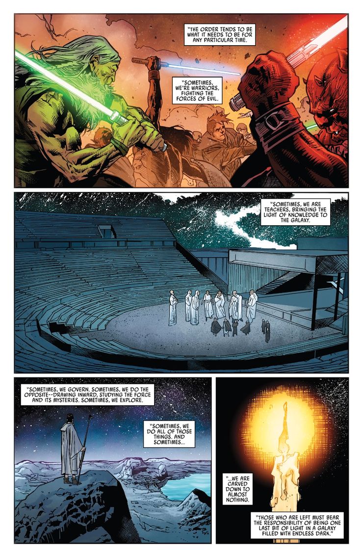 Guerra de las Galaxias #20, de Charles Soule y Marco Castiello, finalmente confirma que Yoda detuvo al Jedi. Ve a Luke Skywalker visitar el Mar Viviente de Gazian, un mundo rico en la Fuerza donde pudo interactuar con un eco místico de un Jedi del pasado, de la Era de la Alta República, unos 200 años antes. Star Wars: Episodio I – La amenaza fantasma. Habló con un eco de Elzar Mann, un Jedi filosófico que contaba la historia de la Orden. Elzar entendió que los Jedi se convertían en lo que la Fuerza quisiera en un momento dado, y que esta maleabilidad debía aceptarse y no resistirse. “La Orden tiende a ser lo que necesita ser en un momento determinado,—explicó Elzar—.A veces, somos guerreros, luchando contra las fuerzas del mal. A veces, somos maestros, trayendo la luz del conocimiento a la galaxia. A veces, nosotros gobernamos. A veces, hacemos lo contrario: dibujar hacia adentro, estudiar la Fuerza y sus misterios. A veces, exploramos. A veces, hacemos todas esas cosas. Y a veces… estamos reducidos a casi nada. Los que quedan deben asumir la responsabilidad de ser un último rayo de luz en una galaxia llena de oscuridad sin fin.“