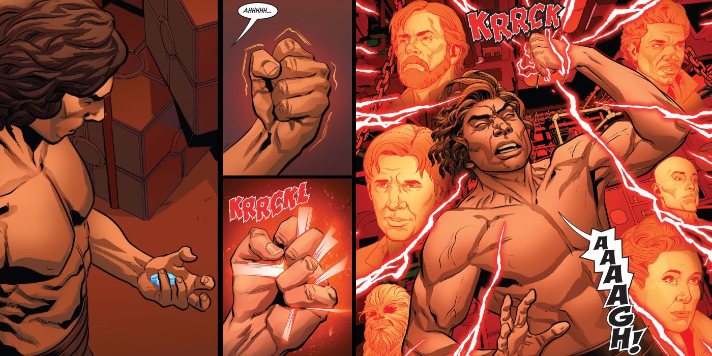 Luke también se unió a un pedazo de kyber joven que le dieron. Guerra de las Galaxias #35. Recibir una visión en la Fuerza como Rey en La fuerza despiertael cristal kyber transparente se volvió verde una vez que se forjó su propio vínculo, el cristal que Luke eventualmente usa para su propio sable de luz visto en El regreso del Jedi. Como tal, este nuevo paralelo narrativo entre Rey y Luke es bastante impresionante en términos de la mayor Guerra de las Galaxias línea de tiempo.