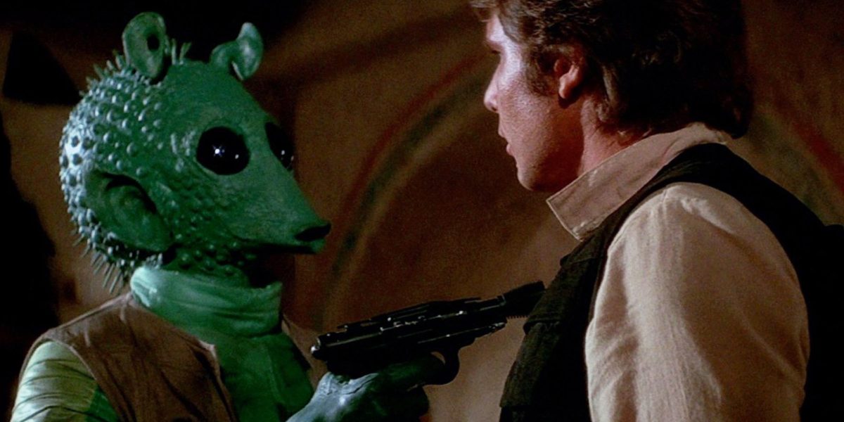 Temprano en Una nueva esperanza, El cazarrecompensas rodiano Greedo se enfrenta a Solo en nombre de una deuda que le debe a Jabba el Hutt. En el estreno teatral de la película en 1977, Greedo dice: "He estado esperando esto durante mucho tiempo", a lo que Solo responde: "Apuesto a que sí", antes de matar a Greedo. Greedo nunca dispara un tiro. Sin embargo, la "Edición Especial" de 1997 de Una nueva esperanza fue editado para mostrar a Greedo disparando primero, para hacer que Solo parezca menos un asesino a sangre fría. Este cambio ha hecho de la escena uno de los momentos más controvertidos en Guerra de las Galaxias historia. Conocido entre los fanáticos como la escena "Han Shot First", ha llegado a representar la ira de los fanáticos por las ediciones en curso de George Lucas a la trilogía original. En el lanzamiento del DVD de 2004, la escena se reeditó para mostrar a los dos personajes disparando simultáneamente (con la desaparición de Greedo), y se eliminaron varios fotogramas del Blu-ray 2011 (haciendo que la escena sea aún más difícil de seguir).