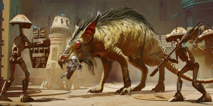 Vale la pena mencionar que las ratas womp comparten la región de Jawa Heights con criaturas monstruosas como los dragones krayt. Esta es la única razón potencial por la que Luke comparte su caza de ratas womp como una gran hazaña: tal vez en Guerra de las Galaxias‘ Tatooine, las ratas de dos metros no son tan grandes como palidecen en comparación con las otras criaturas residentes (incluido el sarlacc enemigo de Boba Fett). Pero la imagen de Peli Motto siendo arrastrada por la rata womp mientras sus adorables pero indefensas unidades BD observan y entran en pánico se erige como un contraargumento a la extraña declaración de Luke en Una nueva esperanza.