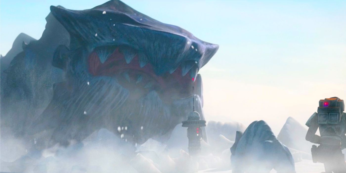 Durante el regreso de Bad Batch a Barton IV, Hunter y Crosshair se encuentran cara a cara con un gusano de hielo gigante identificado por subtítulos como un “wyrm”. Obviamente, el momento es impecable y bastante divertido dado el reciente lanzamiento de Duna: Segunda parte que presenta de manera destacada los icónicos gusanos de arena que viajan a través del planeta desértico de Arrakis y son montados por los nómadas conocidos como los Fremen. Este gusano de hielo no sólo viaja bajo la nieve como Dunas Shai-Hulud, pero también cuenta con una boca grande lista para consumir todo a su paso..