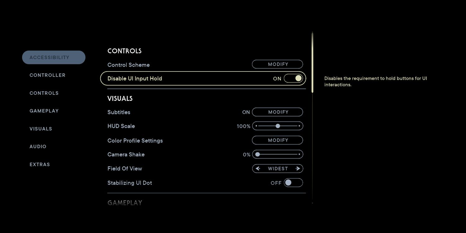 Esta configuración es particularmente útil al navegar por los menús. Desafortunadamente, no se extiende a todas las interacciones que requieren mantener presionado el botón de interacción. Una simple pulsación de tecla suele ser la opción más intuitiva, pero hay algunas opciones que requieren que se mantenga presionado y no hay indicación de cuándo es necesario. Esto a veces es útil para asegurarse de que uno no presione accidentalmente el botón equivocado, por ejemplo, para salir del juego por error. Esta opción hace que la mayoría de las opciones sean una simple pulsación de tecla, lo que elimina cualquier confusión. La opción se encuentra tanto en la pestaña Accesibilidad como en la pestaña Controles.