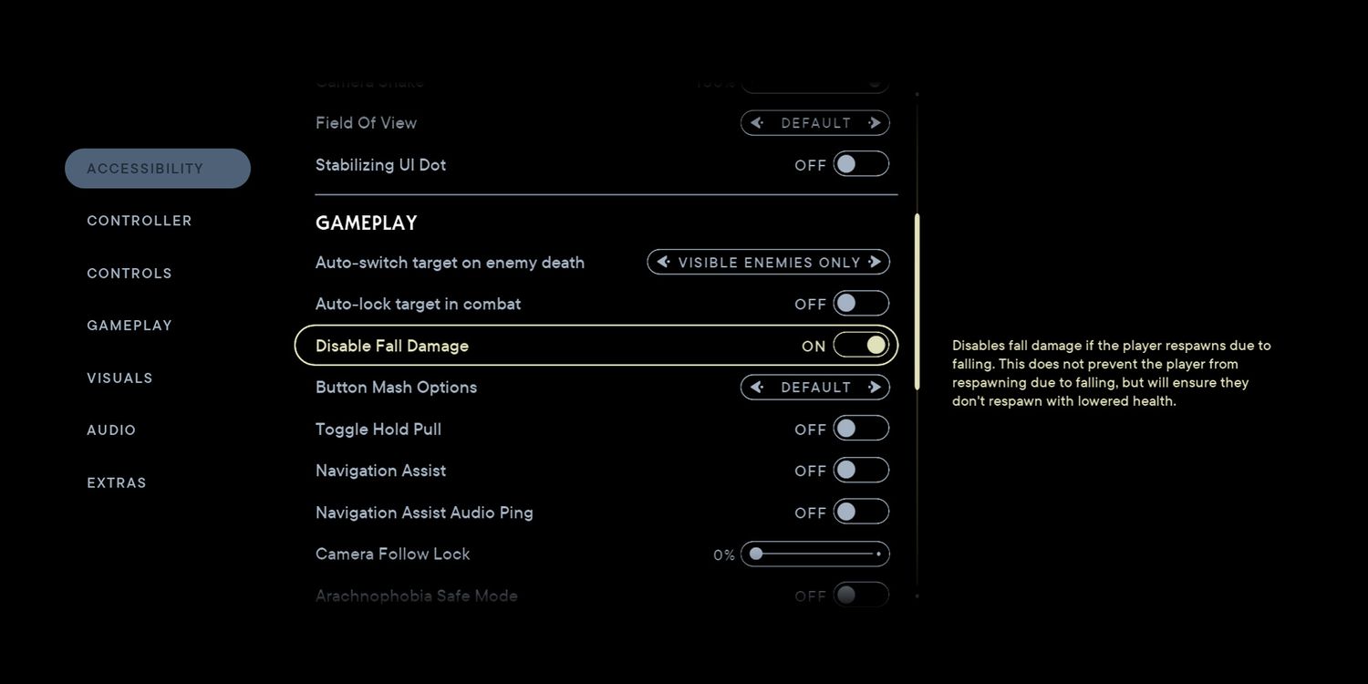 Hay muchos momentos en el juego que requieren que Cal realice movimientos de plataformas en lo alto y un desliz menor hará que se caiga y comience de nuevo en un punto de control. Si bien la caída no causa la muerte del jugador, sí causa que se le quite la salud. Activar Deshabilitar daño por caída puede ayudar a los jugadores, especialmente al principio, ya que Cal aún no tendrá acceso a muchas actualizaciones de Max Stim de BD-1. Esta opción se encuentra tanto en la pestaña Accesibilidad como en la pestaña Jugabilidad en Exploración.