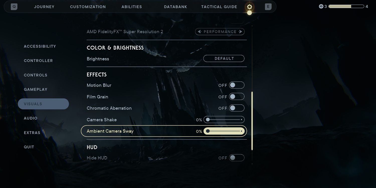La opción para Ambient Camera Sway se encuentra en las pestañas Visuales. Compruebe para asegurarse de que esté configurado en 0% para garantizar movimientos suaves de la cámara.