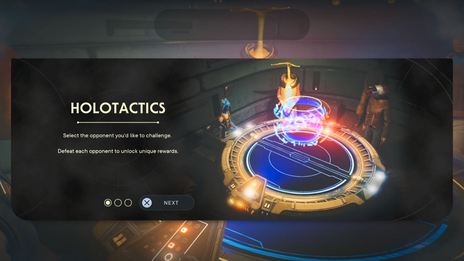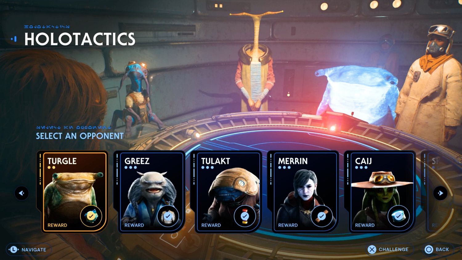 Hay 8 oponentes de Holotácticas para que Cal los enfrente, incluido el regreso Comer: sobreviviente compañero, Merrin. Al revisarlos en la pantalla de selección, habrá círculos debajo de sus nombres. Los círculos indican su nivel de dificultad y coincidencias. Se recomienda comenzar con el oponente más fácil, Turgle, y trabajar desde allí. El último oponente, Tulli, se mostrará como bloqueado y es el único que no se puede desbloquear simplemente a través de la progresión de la historia o la finalización de la misión. Tulli solo estará disponible para enfrentar a Cal una vez que todos los oponentes anteriores hayan sido derrotados. Ella es esencialmente la “pelea de jefes” de Holotactics.