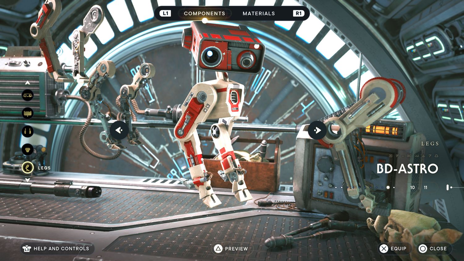 Los jugadores también pueden personalizar el aspecto de BD-1 en el banco de trabajo., intercambiando sus diferentes componentes y cambiando materiales. Como todos los cosméticos en Star Wars Jedi: Superviviente sin embargo, los jugadores tendrán que buscar por todas partes en los planetas de la galaxia para encontrarlos.
