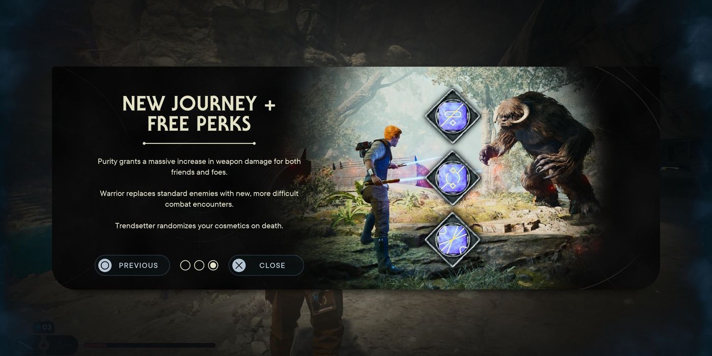 Star Wars Jedi: SupervivienteLa segunda partida de New Journey + en modo New Journey ofrece a los jugadores tres nuevas ventajas: pureza, guerrero y creador de tendencias. Estas ventajas se pueden activar o desactivar en el juego.