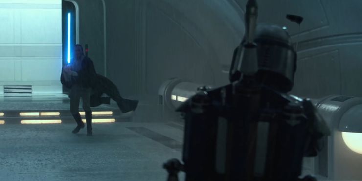 Obi-Wan incluso pierde su sable de luz temporalmente en Kamino y confía en su entrenamiento Jedi con artes marciales para luchar contra él. Incluso con las manos atadas por un cable de metal, logra derribar a Jango Fett, destruyendo así su mochila propulsora.
