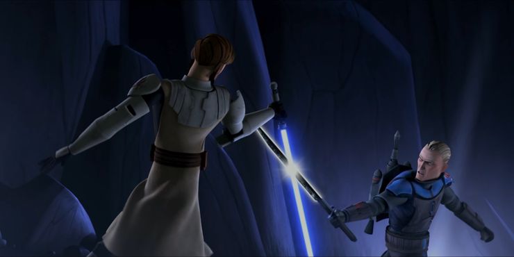Obi-Wan Kenobi siempre ha sido un maestro del sable de luz, pero esta pelea con Pre Visla en la temporada 2 de The Clone Wars demuestra que no necesita uno. Pre Visla maneja el Darksaber y demuestra ser un oponente formidable, incluso asesta algunos golpes poderosos a Obi-Wan.