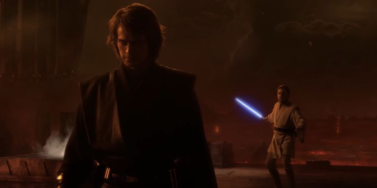 Incluso cuando Anakin desarma a Obi-Wan, su mentor aún logra reclamar la victoria. Está destinado a mostrar que no importa cuán poderoso se vuelva Anakin, Obi-Wan siempre será el guerrero más hábil y sabio.