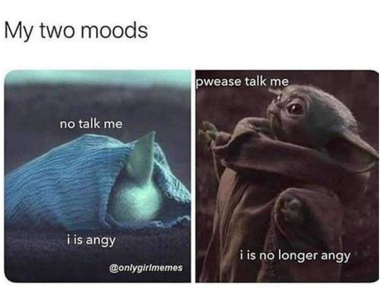 Se puede identificar a Baby Grogu en varios aspectos, especialmente en el sentido de que parece tener solo dos estados de ánimo: cansado y enojado, y necesitado y no enojado. ¡A veces no queremos hablar! A veces está bien estar enojado.