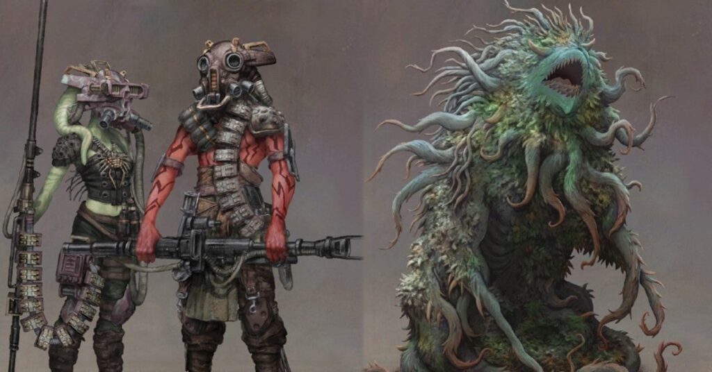 “Iain había estado dibujando monstruos y había una criatura que estaba cubierta de enredaderas y enredaderas”, recuerda Scott. “Desató la inspiración para lo que se convirtió en el Drengir y rápidamente publiqué un documento que describía cuál podría ser su cultura y antecedentes para el resto del grupo, basándose en investigaciones que había estado leyendo sobre cómo las plantas del mundo real prosperan y se comunican juntos.”