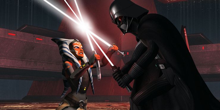 Como si saber que su maestro Jedi se convirtió en un Lord Sith no fuera lo suficientemente difícil, Ahsoka termina enfrentándose a él en combate en Malachor. Ella intenta traerlo de vuelta a la luz. Cuando atraviesa su máscara, puede ver un remanente del rostro que pertenecía a Anakin Skywalker.
