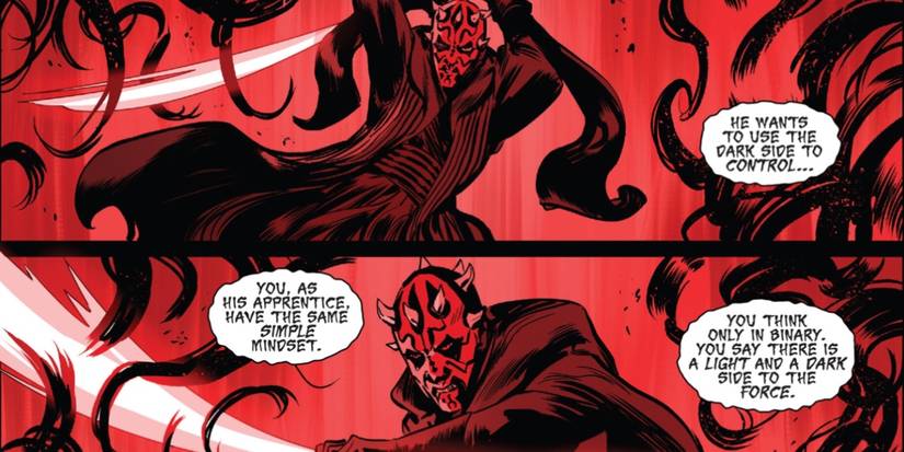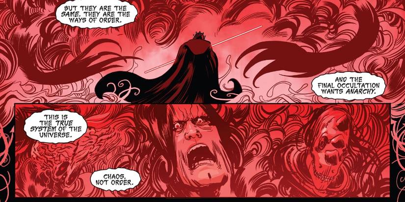 Una teoría revelada después de que un miembro de The Final Occultation, una orden “ayudada por fuerzas caóticas que fluyen desde el Inframundo” que prometen destruir a los Sith, toma la mente de Maul y trata de arrastrarlo a la locura, Maul luego logra matar a dos altos funcionarios. líderes de alto rango del culto, luego sigue los gritos hasta el último sacerdote. Maul, que se describe a sí mismo como “un emisario del caos”, lucha con esta entidad oscura y le dicen que “Sidious tiene ambiciones equivocadas” al intentar utilizar el lado oscuro para “controlar”, revelando que “Caos. No orden” es el “verdadero sistema del universo”.
