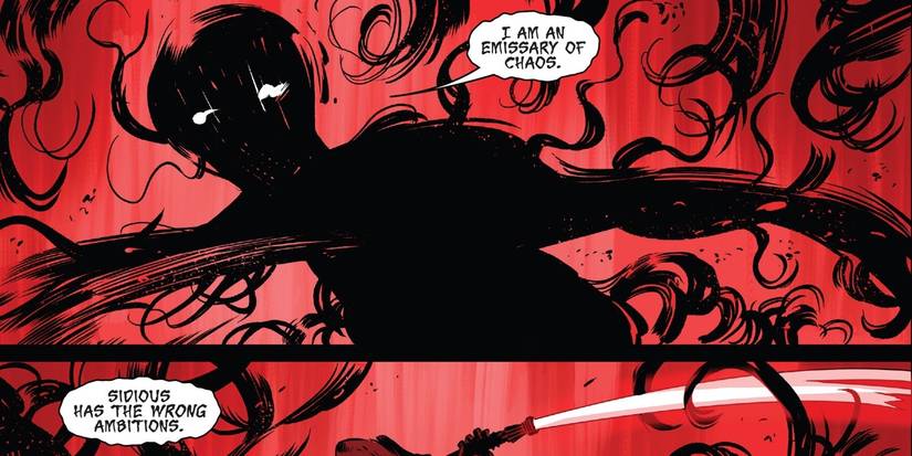Star Wars: Darth Maul – Negro, Blanco y Rojo #1. - Una entidad oscura vinculada al culto de la Ocultación Final insinúa que el rechazo del orden de la galaxia era inevitable, lo que provocó el fracaso de Palpatine junto con cualquier otra cosa que imponga el orden.