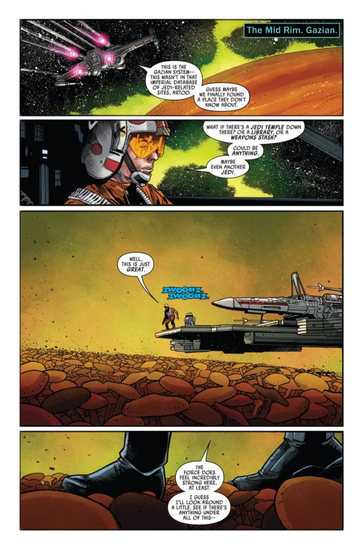 En la vista previa exclusiva lanzada por StarWars.com, Luke llega al Sistema Gaziano, el planeta que está fuera del radar del Imperio, porque cree que contiene secretos de la Orden Jedi que lo ayudarán en su entrenamiento continuo. Después de que Luke aterriza y camina hacia el planeta, ve que el suelo no es más que un mar interminable de sustancias que parecen hongos y, al caminar sobre la superficie, desciende rápidamente debajo de él y parece desmayarse mientras lo succionan bajo tierra. Cuando Luke Skywalker se despierta, está sentado en una silla junto a un hombre que nunca ha conocido, uno que demuestra su dominio de la Fuerza de inmediato, sentando las bases para que sea el nuevo maestro de Luke.