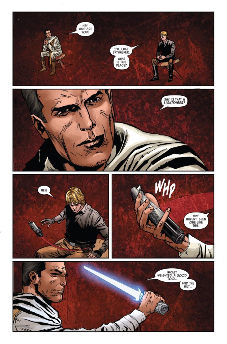 Después de que Luke conoce a la misteriosa figura en estas impactantes y horribles circunstancias bajo la superficie del Sistema Gaziano, pregunta dónde está. En lugar de responder, el hombre usa la Fuerza para agarrar el sable de luz de Luke. El hombre comenta sobre la empuñadura del arma Jedi y el peso, dejando en claro que ya había empuñado una antes.