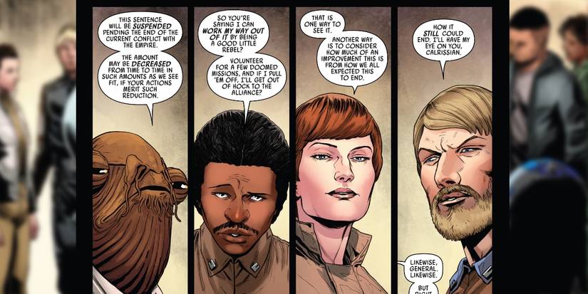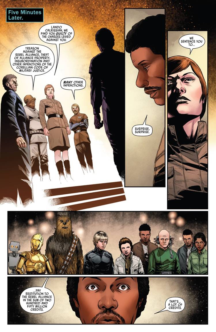Teniendo lugar en lo canónico de Marvel. Guerra de las Galaxias serie de Charles Soule y Madibek Musabekov, el nuevo Guerra de las Galaxias #47 revela el fallo final del tribunal de la Alianza sobre Lando y su sentencia. Dado que los testigos compartieron todo el alcance del carácter de Lando y el propio Calrissian subió al estrado en defensa de sus acciones para salvar a su amigo, todo lo que quedaba era que el almirante Ackbar, Crix Madine y Mon Mothma revelaran su decisión. Por lo tanto, la decisión final resultó ser sorprendente y, al mismo tiempo, bastante adecuada.