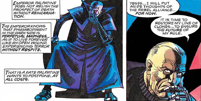 En la historia ahora no canónica pero aún increíblemente influyente presentada en 1995 Star Wars: El fin del imperio #1, Palpatine se ve obligado a reflexionar sobre lo que significa la vida futura para un miembro de los Sith, y se revela que la experiencia es “vivir para siempre como una herida abierta”.