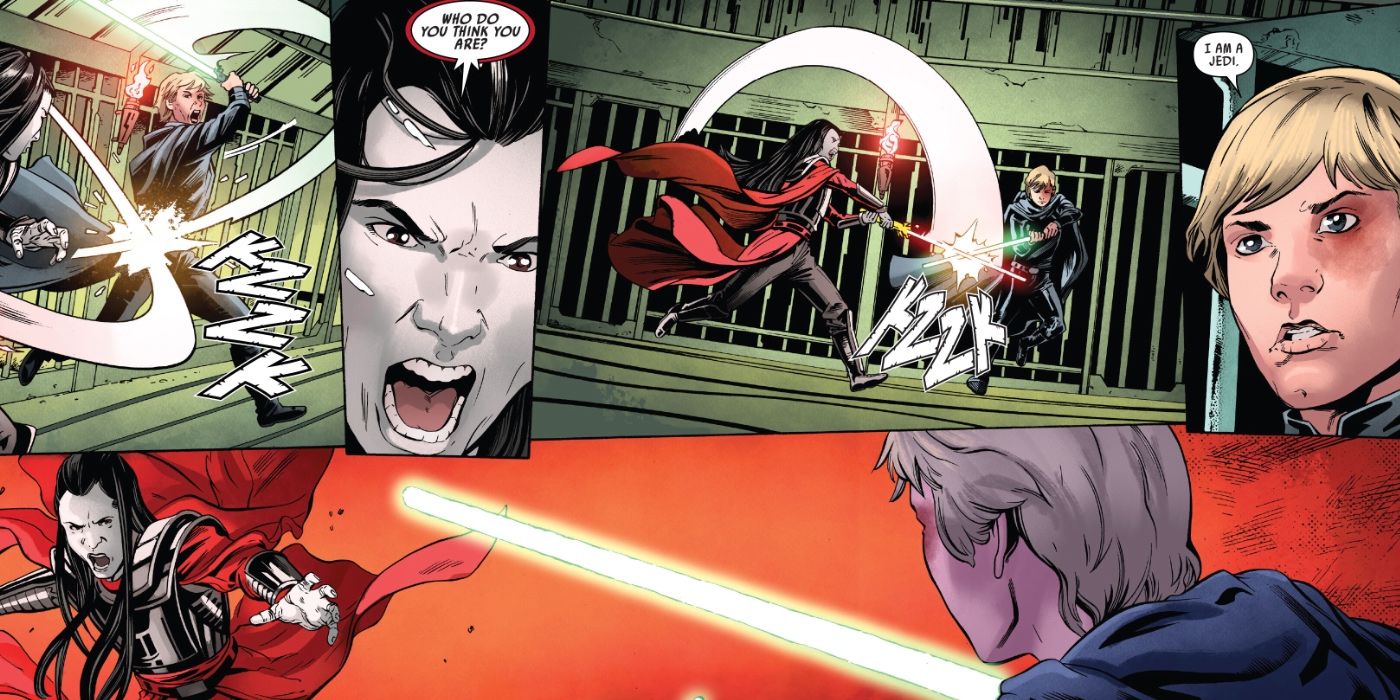 Como se vio en Guerra de las Galaxias #43 Por Charles Soule, Steven Cummings y Jethro Morales, Luke Skywalker ha sido encarcelado por el espíritu del antiguo “Rogue Sith” que fue el primero en corromper este cristal kyber en particular, mantenido por su propio dolor y oscuridad pasada. Sin embargo, Luke se libera de su control y busca curar el dolor vivo que aún está atado al cristal. Esto incluye un momento importante en el que Luke enciende el sable de luz en su cinturón para batirse en duelo con este Rogue Sith, aunque le sorprende su nuevo color..