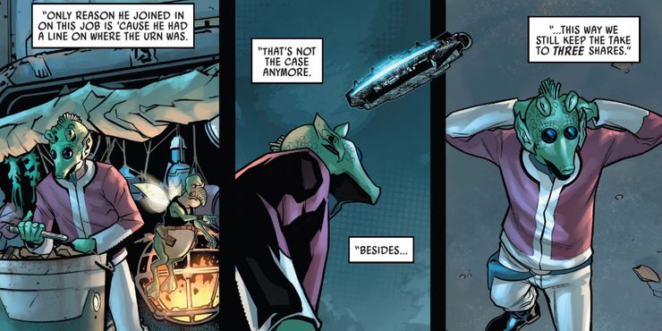 Ahora, Han Solo y Chewbacca #3 presenta a Solo y su primer compañero en Corellia, el planeta natal de Han. Según Greedo, se suponía que la urna estaba en posesión de uno de los seres más ricos del planeta. Al descubrir que la urna fue sacada de otro mundo, Han y Chewie suben a bordo del Halcón para ir tras él (junto con el padre recién reunido de Solo, Ovan). Sin embargo, Han despega intencionalmente sin Greedo para no tener que dividir el dinero de la recompensa con el rodiano.