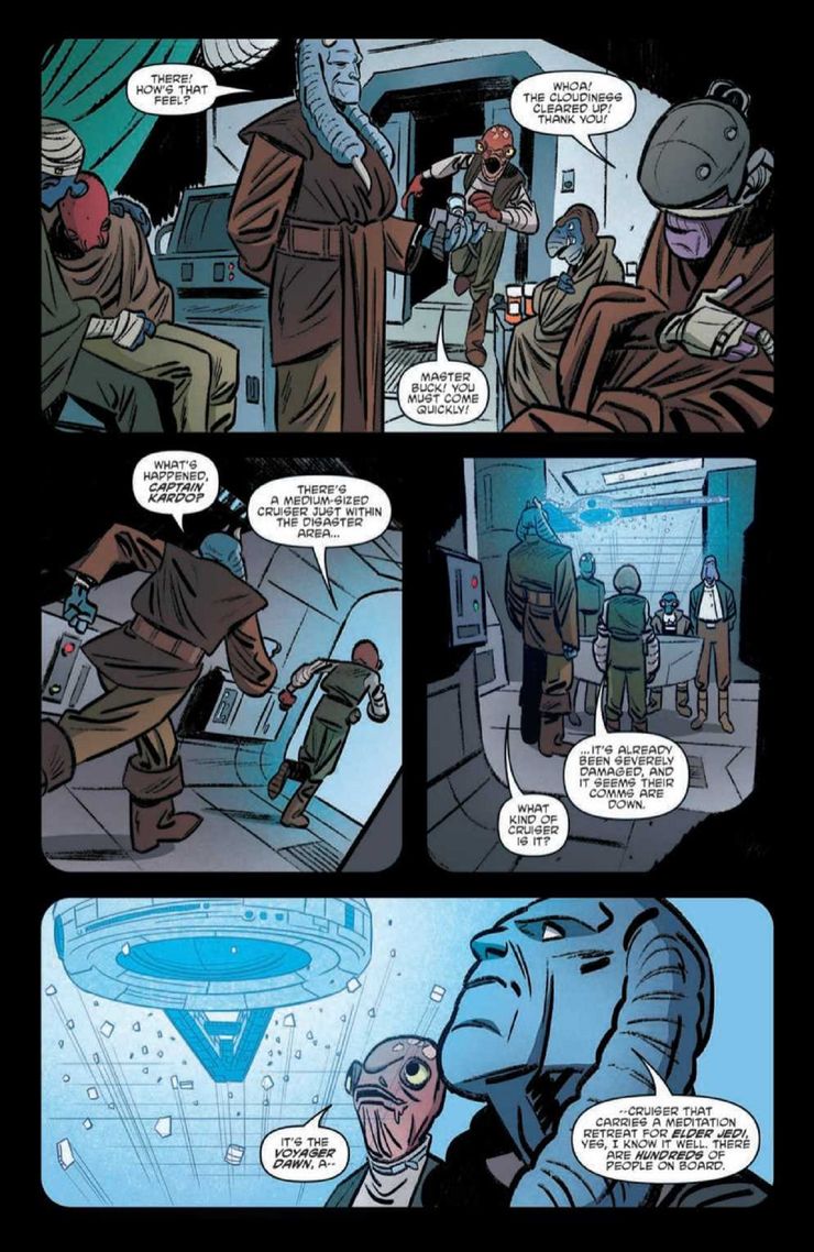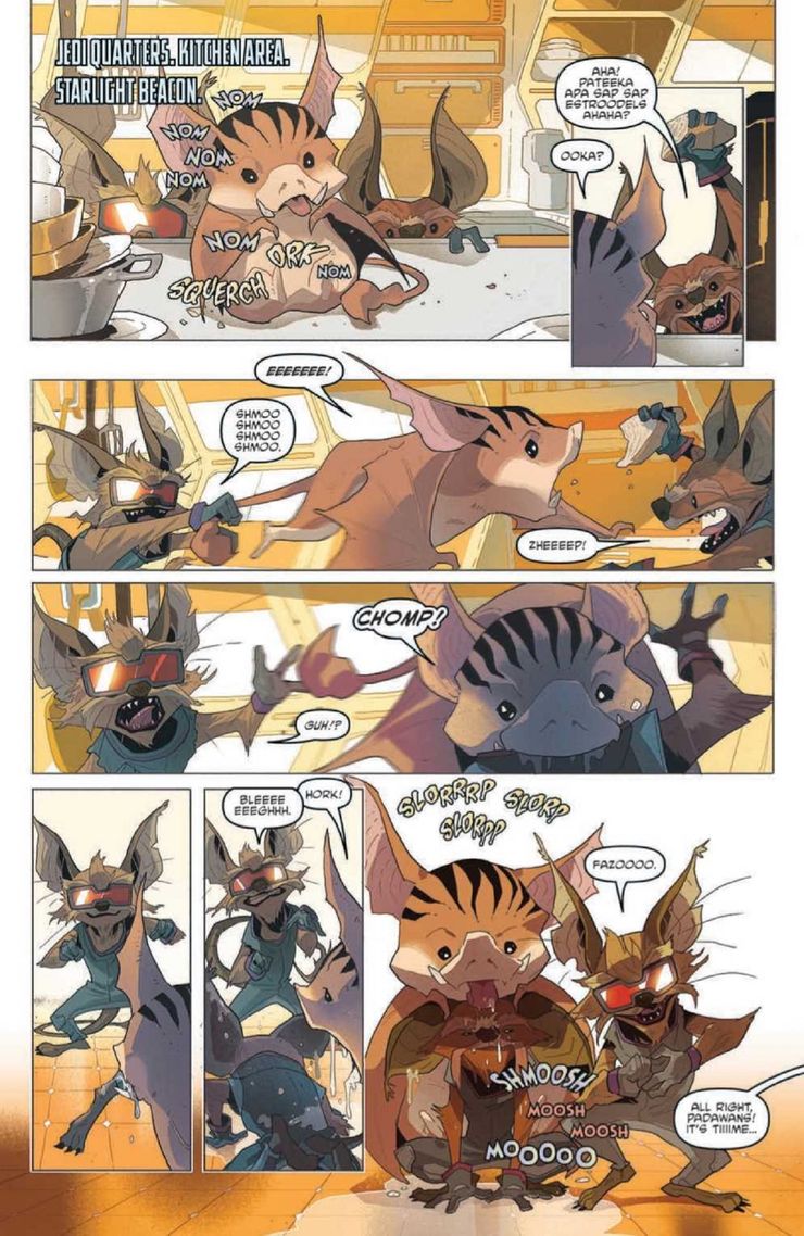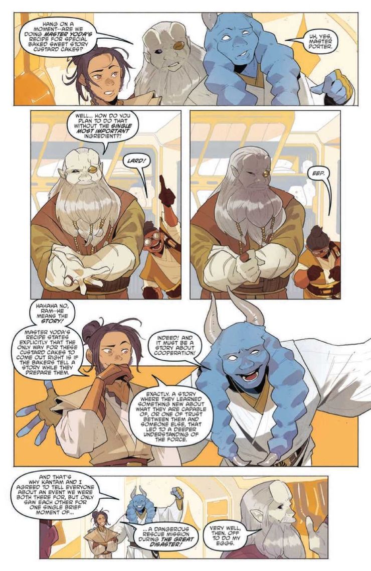 El webzine Comic Crusaders lanzó un adelanto de Star Wars: The High Republic Adventures – Galactic Bake-Off Spectacular, incluida la página de créditos, cinco páginas interiores y la portada de Jason Loo. La información solicitada detalla que el número presentará a los personajes de Torban “Buckets of Blood” Buck y Kantam Sy enfrentándose entre sí, no en una pelea física, sino en un horneado para hacer la receta especial de pastelería del Maestro Yoda. La descripción incluso promete que la receta de estos pasteles se incluye en la parte posterior del cómic. Aparentemente, se requiere una historia épica para crear los pasteles, por lo que Buckets of Blood y Kantam cuentan historias de batallas en sus vidas mientras crean esta delicia. La recompensa para el ganador: la aprobación de Padawan. La vista previa a continuación les da a los lectores una mirada al área de la cocina en Jedi Quarters of the Starlight Beacon, así como una mirada retrospectiva a “The Great Disaster”.