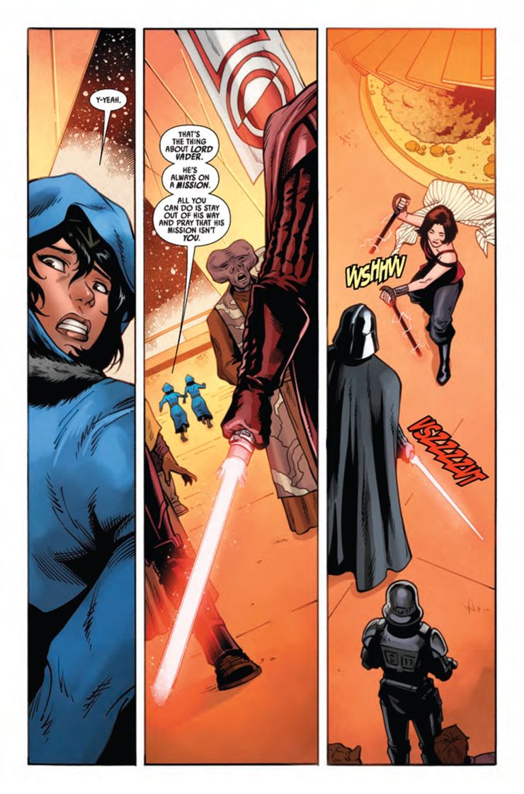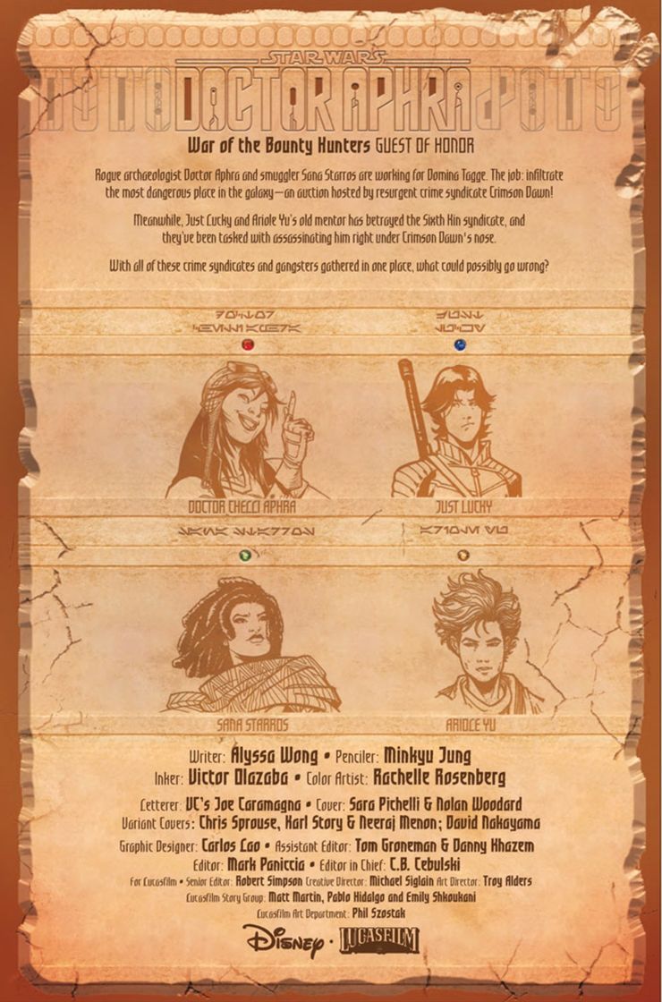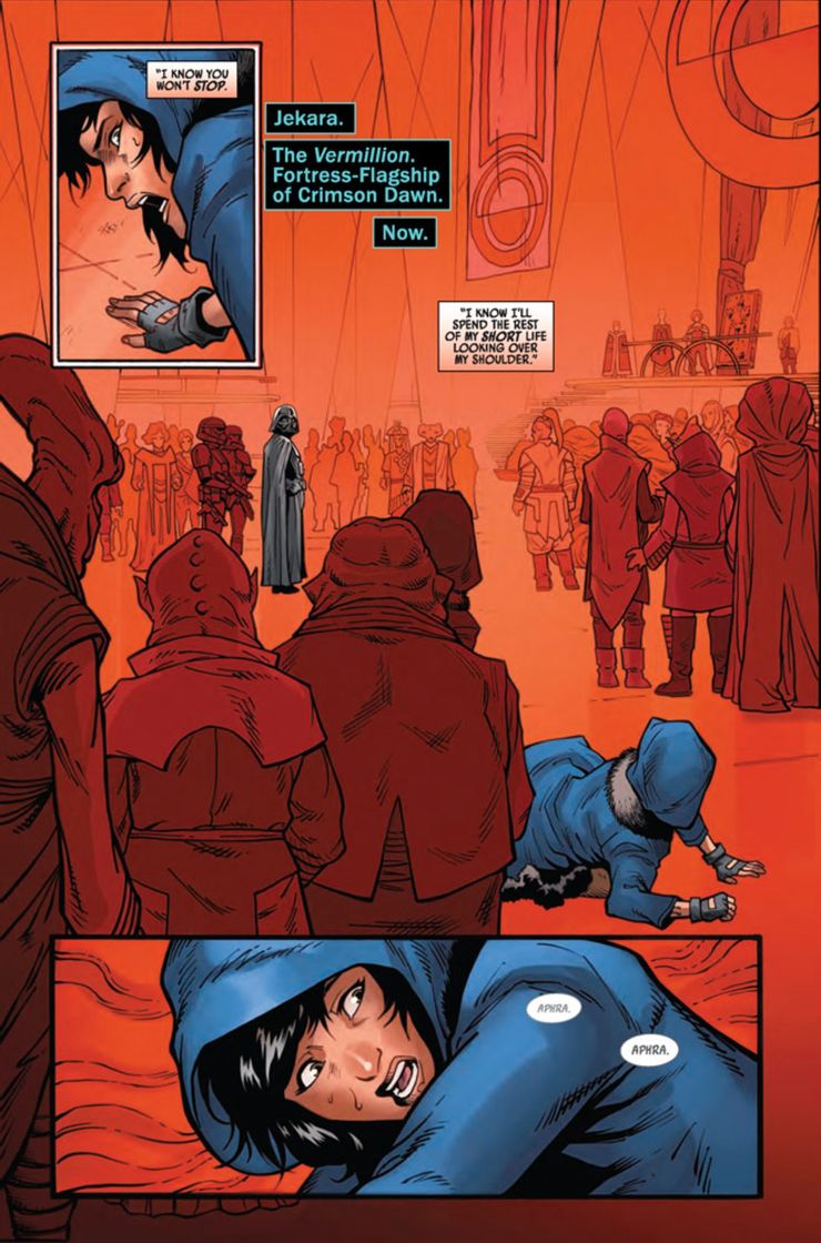 Esta vista previa comienza con Aphra recordando su último encuentro con Darth Vader. Mientras estaba en la subasta de Crimson Dawn, el señor Sith hizo una entrada muy notable. Aphra está lista para huir con Sana, quien no conoce la historia completa sobre el tiempo de su amiga con Vader. Sus últimas interacciones en Doctora Aphra (2016-2019) se resumen brevemente. Aphra definitivamente tiene una razón para mantenerse lo más lejos posible de su antiguo jefe.