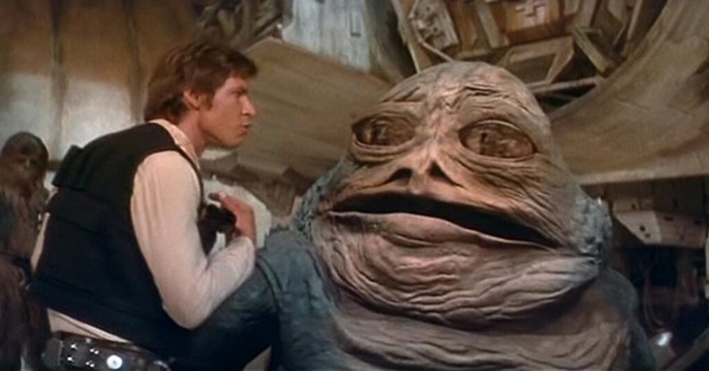 Jabba the Hutt no hizo su debut oficial en una película de Star Wars hasta Guerra de las Galaxias: El regreso del Jedi, donde apareció como una enorme criatura parecida a una babosa. Sin embargo, George Lucas filmó un encuentro entre el gángster y Han Solo de Harrison Ford para Star Wars: una nueva Esperar, aunque finalmente descartó la secuencia. En este punto del desarrollo de la franquicia, Jabba fue imaginado como un gran personaje humanoide vestido con pieles de piel. Esta figura apareció recientemente en Guerra de las Galaxias, sirviendo como un sutil homenaje al actor Declan Mulholland.