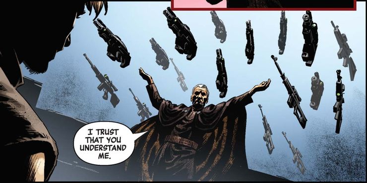 En las peliculas X Men (2000) y X-Men: Días del Futuro Pasado (2014), Magneto se enfrenta a enemigos armados con armas. Para obtener la ventaja, usa su habilidad para manipular el metal para quitarles las armas, rotarlas y apuntarlas a sus portadores originales. Este es un momento que tiene mucho peso en ambas películas, ya que Magneto podría fácilmente apretar los gatillos de cada arma simultáneamente y eliminar por completo la amenaza frente a él. Ahora parece que Magneto no es la única persona que puede hacer esto. El Conde Dooku, y presumiblemente otros sensibles a la Fuerza, podrían realizar el mismo truco. Dooku desarma a sus oponentes fácilmente y comienza las negociaciones con un poco de palanca extra, apuntando las propias armas de Kaldana hacia ellos. La pregunta entonces es: ¿podría el Conde Dooku también haber apretado los gatillos de cada arma simultáneamente? ¿O solo puede desarmarlos?