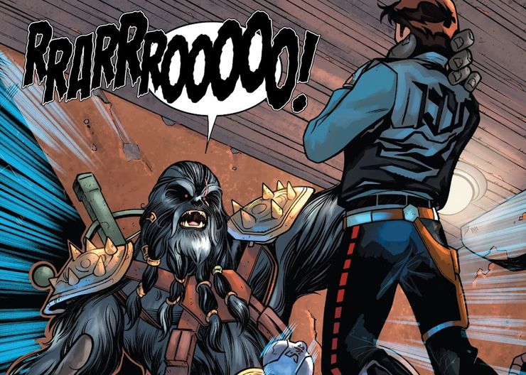 En Han Solo y Chewbacca #3 por Marc Guggenheim David Messina, Han y Chewie son contratados por el gángster Jabba the Hutt para robar las cenizas de su rival muerto. Después de un intento desastroso de reclamarlo, Han finalmente lo rastrea hasta un comerciante. Le dice a Chewie que espere junto al barco mientras Han, junto con su padre, ingresan a la casa de la mujer para robarlo. Cuando llegan, encuentran a los Stormtroopers ya noqueados. Luego, la pareja es atacada por el Wookiee Black Krrsantan. Entonces, con Han en problemas, es probable que Chewbacca regrese para ayudar.